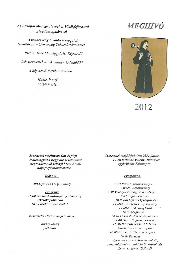 Velény Község Önkormányzata nevében tisztelettel meghívjuk Önöket az Európai Mezőgazdasági Vidékfejlesztési Alapból a Helyi Vidékfejlesztési Stratégiák LEADER fejezetének keretén belül 2012.06.17-én megtartandó tematikus rendezvényre.